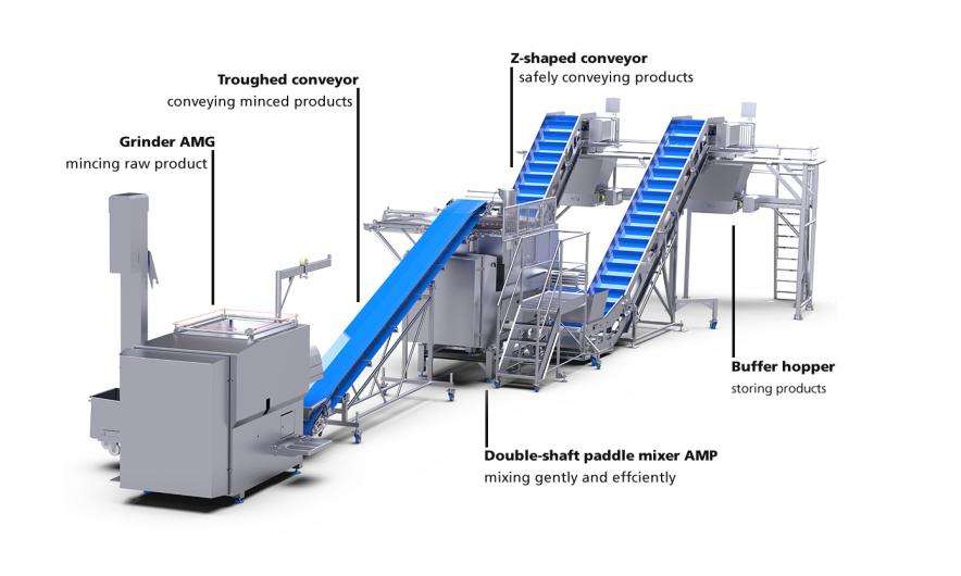 The ground mass is mixed in an AMP alco mixer by the mixing devices (mixing shafts) in the mixer trough of the machine. The direction of rotation of the shafts can be changed to achieve a perfect, fast thorough mixing. Depending on the application, different mixer sizes (350-1000 l) and mixer shafts, e.g. paddle, spiral or special mixing tool are available. The alco paddle mixer is particularly suitable for product-protecting, yet highly efficient, mixing to a homogeneous mass. Other equipment options include cryogenic liquefied gas or steam to reach the target temperature, as well as various liquid dosing devices. Another optional production step is mixing the products under vacuum to produce a bubble-free product of improved quality and increased protein yield. Heated or coolable mixer troughs with double walls are also available from alco.