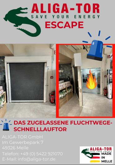 Im Gegensatz zu anderen Toren oder Türen im Markt dürfen ALIGA-Escape Tore mit der Zulassung als geregeltes Bauprodukt entsprechend der LBO als Fluchttür in Rettungswegen betrieben werden. Ergänzend dazu ist das ALIGA-Escape nach DIN EN 179 geprüft und zertifiziert. Ohne die Diskussion um Auslegungsfragen erfüllt das Tor so alle erforderlichen Voraussetzungen für einen zuverlässigen Betrieb als Schnelllauftor in Flucht- und Rettungswegen