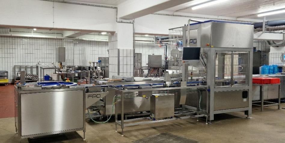 Die Verpackungsanlage übernimmt die fertig etikettierten Schalen und kontrolliert die Etiketten auf