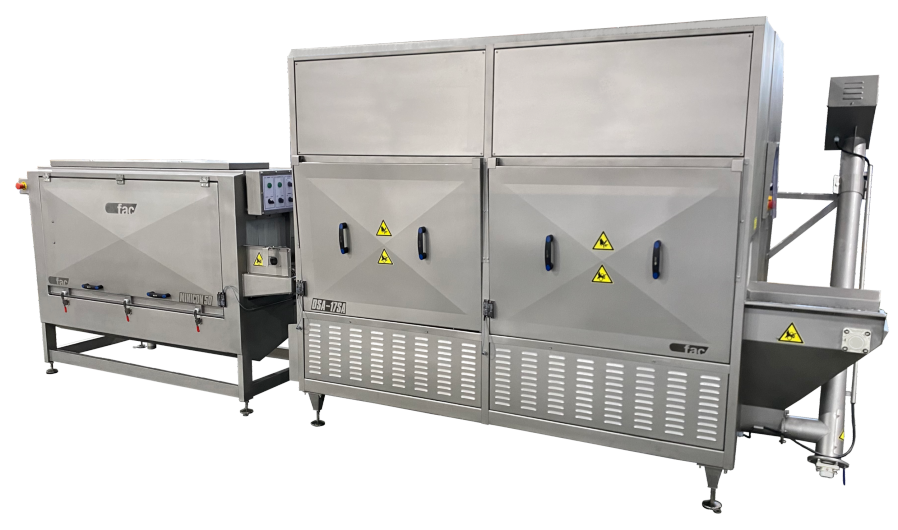Our desalination and washing line is made up of two machines connected online: the DSA-17-SA desalination plant, which recovers dry salt by blowing high-pressure air, and the MINICON washing machine, which uses clean water without recirculating, consuming less than 1.5 liters of water for each ham or shoulder.