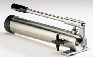 All stainless steel hand-operated hydraulic pumps. Can be used for oil and water/water-glycol hydraulics