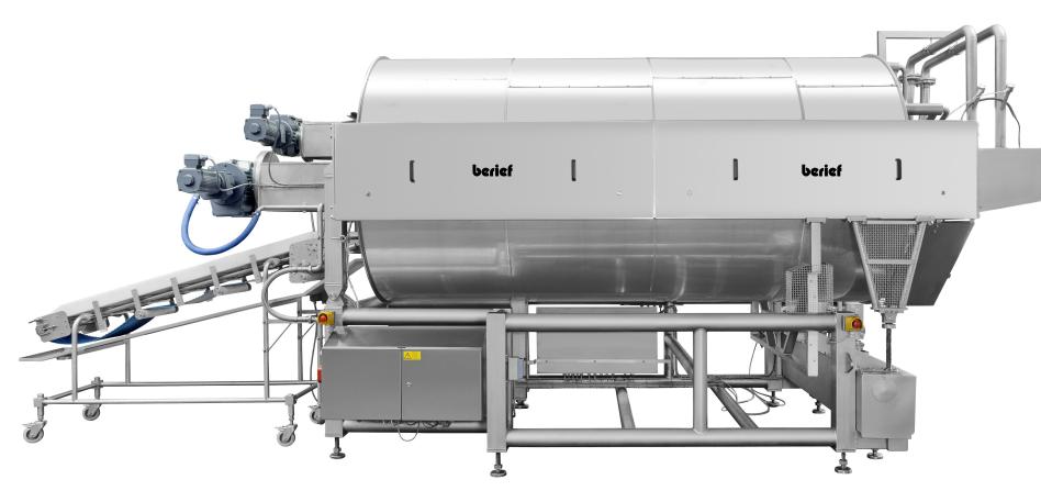 The continuous industrial wok type ContiWok allows the roasting and cooking of products in a horizontal roasting drum while the inner wall as the roasting surface is continuously kept at the pre-selected roasting temperature. The food products which are transferred into the drum are permanently turned by rotation of the horizontal axis. This movement is additionally supported by an agitator. Cooking oil as roasting fat is dosed at the drum infeed. The advantage is a fast frying to seal of products in order to develop a roasting taste by minimizing at the same time product losses. The products to be processed can either be pre-cooked or raw.