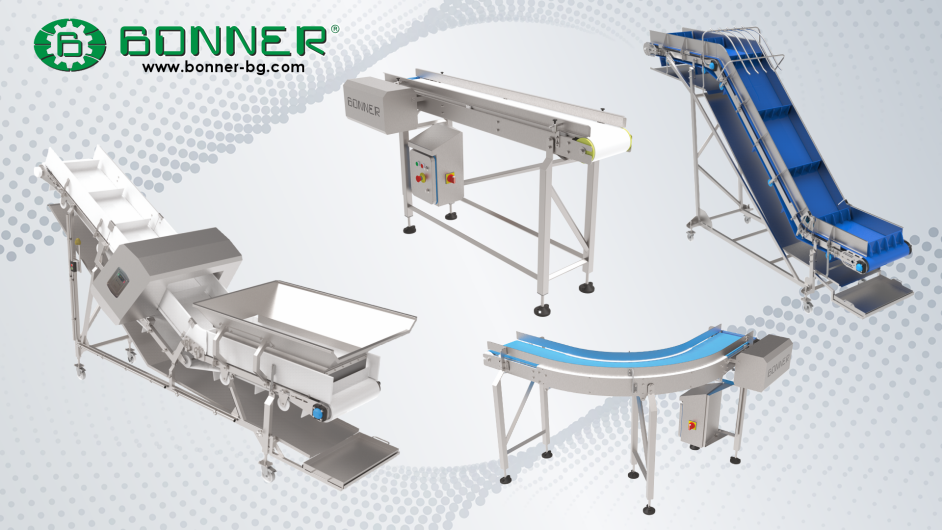 Bonner manufactures different types of belt conveyors made of AISI 304 (1.4301) stainless steel. Main application: to be included in production lines, providing automated connection between technological machines. They are manufactured according to the customer's technical specifications, according to the requirements of the technological process. They are performed in horizontal, inclined, with straight or curved sections. Construction mounted on legs, wheels, suspended from the ceiling or wall, with different types and materials of belts according to the purpose and type of product. A version with metal detection is also available.