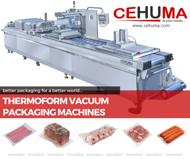 CEHUMA CM series thermoformers are suitable for automatic vacuum applications and very often used in fresh meat, salami, sausages, cooked meat, sliced salami, whole chicken, chicken nuggets, chicken, schnitzel, poultry and so on... The machine is chain driven type which means the plastic film material forward movement is done by the gripper chain system. Further, CM series are suitable for processing of both the flexible and rigid plastic films up to a width of 600 mm and a thickness of 1200μm with a cycle speed of 5 - 12 per minute.