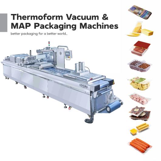 CEHUMA YZ thermoformers are mainly for automatic filling and sealing applications and very often used for filling and sealing of water, juices, ketchup, mayo, honey, jam, chocolate paste, nut paste, cream cheese, coffee, milk, yogurt ... The machine is a cam driven machine which means the plastic film forward move is done by a mechanical cam system leading a very high output preformance up 35 cycles per minute.