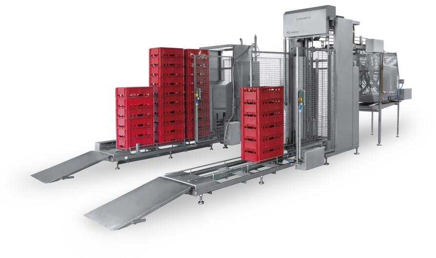 Cleanetic stacking and destacking systems are a response to the growing need for automation of production processes in order to optimize the use of washing devices, especially high hourly efficiency. The destacker and stacker are adapted to work with automatic washing lines of high efficiency. These systems, depending on the combination with the specific size of the washing line, allow for reducing the necessary service by up to 80%, constituting a significant element of cost savings.