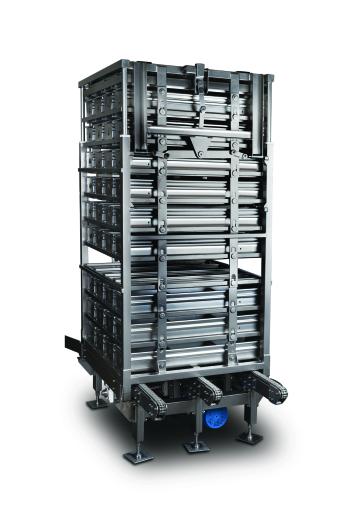 A Multimold Tower for molding products like ham or bacon or plant-based. It can have molds for small products, o for slicing; it can have standard shapes or special shapes. It can be a small Tower with only 5 level and 5 molds per level, or a big Tower with over 10 levels several molds per level.