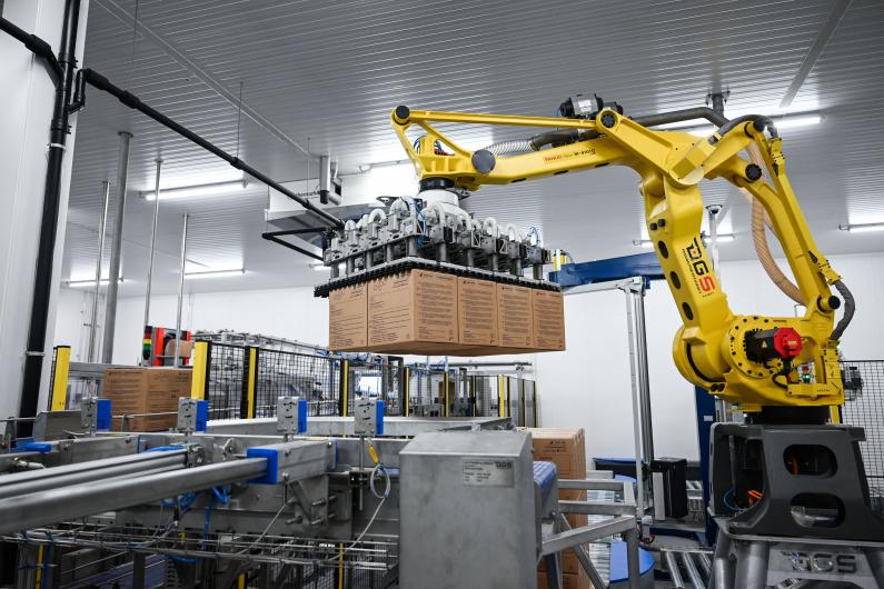 Our robots can palletize crates and boxes at the same time, allowing one robot to serve multiple production lines. This not only reduces space requirements but also boosts efficiency.