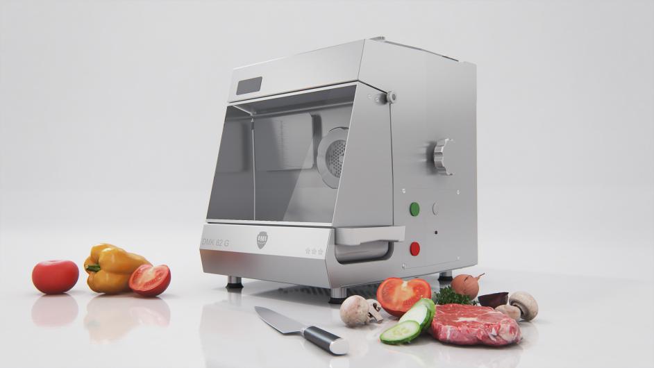 Fleischeinwurfschüssel aus Edelstahl, gekühlt, mit Echtglasabdeckung Schneidraum gekühlt und beleuchtet Vitrine aus Echtglas zum Öffnen und Schließen des Schneidraums mit Magnetsicherheitssensor Technische Daten: