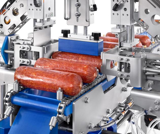 TDSAL automatic machine for clip removing and / or cutting in half, 45° or 90° angle, for cooked and cured products with 2 declipping heads and 1 cutting station and TTDDSAL with 4 declipping heads and 2 cutting stations.