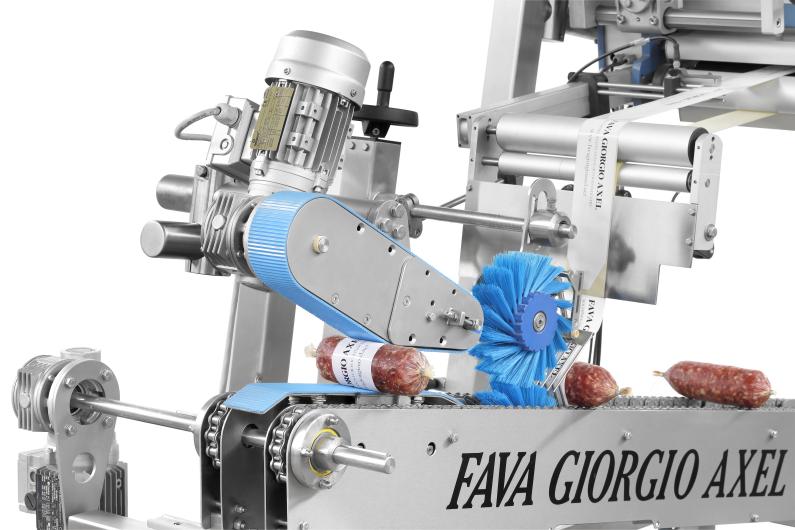 Automatic labelling machine for salamis Etiflex, pneumatic working and control, made of stainless steel and of plastic material for food contact.