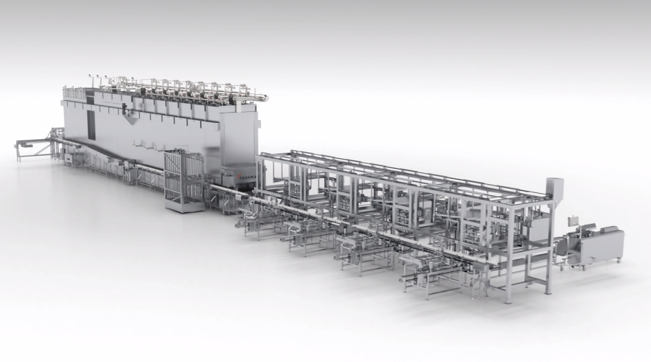 The latest development from FESSMANN is the fully automatic loading unit with integrated smoke stick management for the continuous production system of type Transfer TF4000. The smoke sticks are made available to the respective suspension line of the plant operator for automatic loading. The unit is flexible and can be connected with the standard commercial suspension lines of leading manufacturers. This makes it even more flexible as regards integration into existing production lines. The smoke stick to be loaded is filled mechanically with freshly stuffed product and fed into the system. The flexible system is space-saving and can also be retro-fitted in existing facilities of type TF4000. The advantage of the system by comparison with robot applications is its simple maintenance.