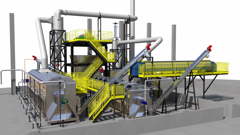 The system includes a reception hopper, screw conveyors for feeding and extraction, an exhaust system for gas removal, a cyclone for fine separation, and an absorption tower for gas washing. The layout is customized according to the client's plant.
