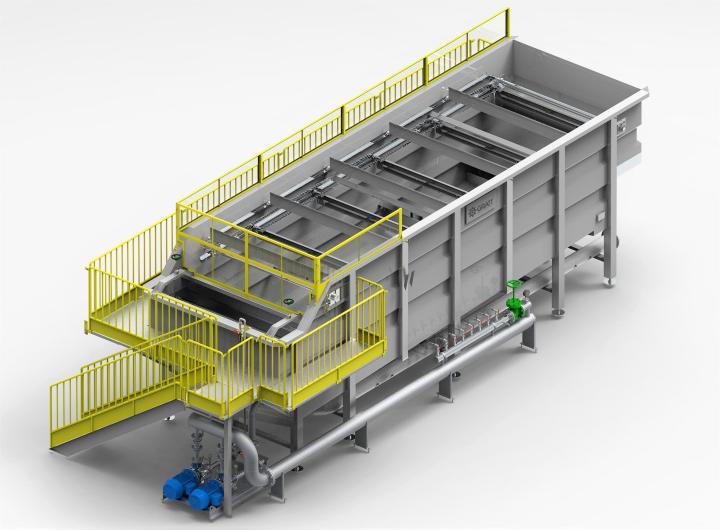 Dissolved Air Flotation (DAF) is a process used to remove suspended solids, oils, and grease from wastewater. It works by injecting air into the effluent through microbubble pumps. The air bubbles attach to solid particles, making them rise to the surface, where a scraper removes the floating sludge. To enhance the efficiency of the process, coagulants and polymers are added to improve floc formation. DAF can be used in primary treatment to separate solids from liquids, replacing sedimentation systems. In tertiary treatment, it helps remove nutrients such as nitrogen and phosphorus, improving effluent quality and ensuring proper water clarification.