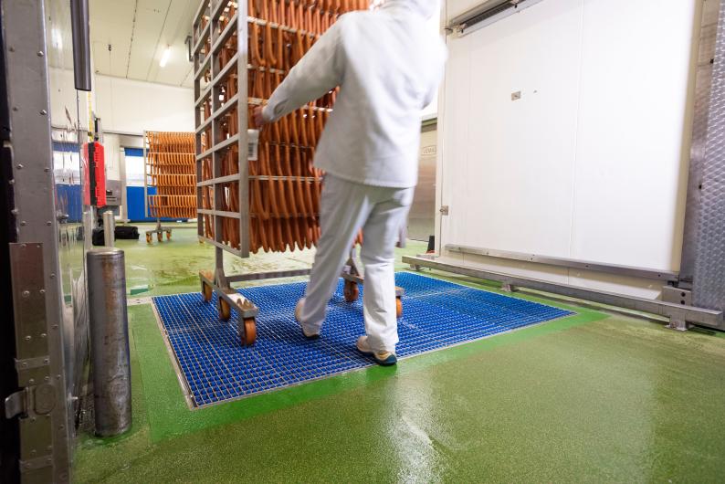 Compliance with strict hygiene regulations is a challenge in meat processing plants. Entrance areas for clean production in particular are potential danger points for cross-contamination. Not only employees can transmit germs, but also transport and smoking trolleys are often pushed through low and high-care areas without thinking. ProfilGate aqua helps to significantly minimise the spread of germs.
