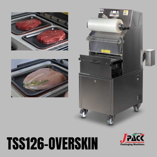 Thanks to OVERSKIN technology, the TSS126 semi-automatic pneumatic thermosealing machine allows not only traditional tray sealing, but also the packaging of protruding products, such as cuts of fine meat or crustaceans, with bulges extending up to 40mm. The technological efficiency of the