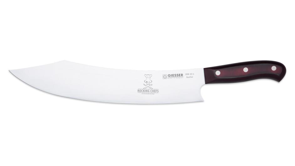 The BBQ No. 1 meat knife is unique because of its shape, texture and processing. The 30 cm long knife blade may at first glance frighten some. But please do not worry. The knife is not too heavy, can be used very precisely and safely. The sharpness produced in elaborate manual work supports and increases the advantages of the long blade. The universally applicable knife, whether as a meat knife or cooking knife, on the grill or in the kitchen, convinces by excellent cutting. Each cut becomes an experience. However, it is not only the manual work that is important in the production of this masterpiece. High-tech machines and plants are also of paramount importance at GIESSER. The blades are cured in the latest vacuum technology, heated to 1050 ° C and cooled down with nitrogen. 56-57 degrees of hardness are the result, thus, providing the guarantee for best cutting performance. GIESSER's knives specialists also attach great importance to the selection of the knife handles and their processing.