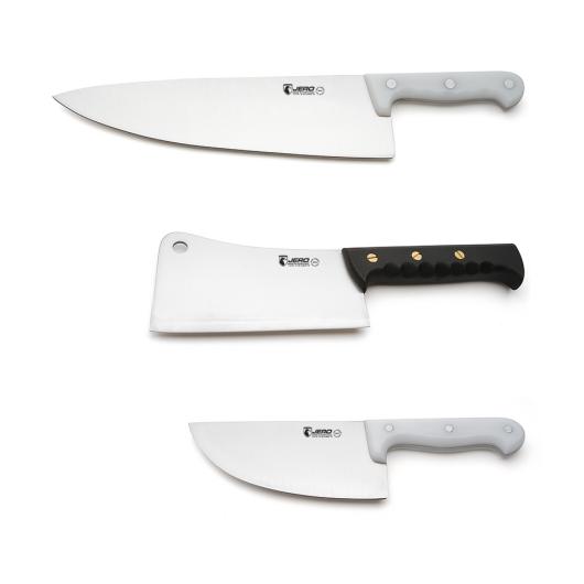 A professional line of Butcher Cleavers and Knives with polyethylene handles and stainless steel rivets.
