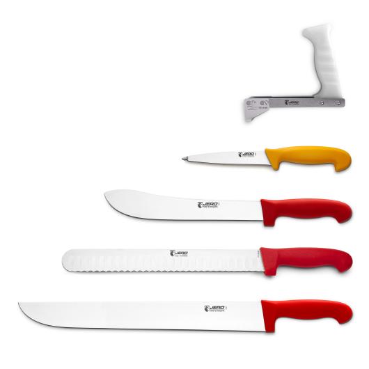Jero has a wide variety of color-coded knives and professional utensils for meat & food processing industry including bacon rippers, protective stainless steel gloves, gut & tripe knives, small poultry knives, kebab knives among many others.