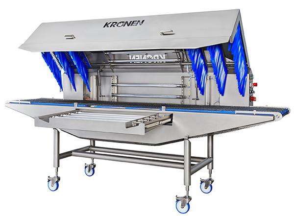 The capacity depends on the product and the contact time, which determines the degree of germ reduction. Cabbages, for example, can be disinfected at a rate of up to 3,000 kg/h at belt speeds of 0.05 to 0.3 m/s. If transport boxes (600 x 400 mm) are used, this figure increases to up to 900 units per hour at a belt speed of 0.2 m/s.