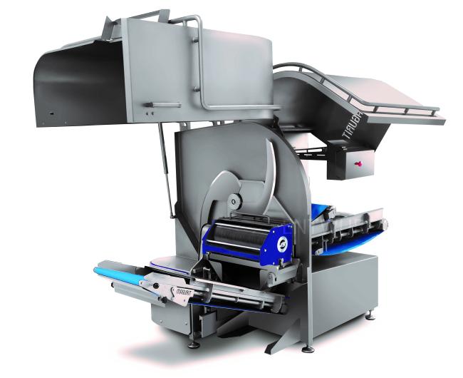 The product is placed manually or automatically onto a product infeed-conveyor belt and thus transported towards the cutting area. Continuously working scimitar blades perform the first dimension cut of the required piece size, which results from the speed of the belts in correlation to the rotation speed of the scimitar blades. Conveyor belt and scimitar blades are infinitely speed adjustable, allowing a change of cutting thickness in just a few moments. Due to the knife geometry, the scimitar blades achieve a clean, pulling cut, without squeezing and mechanical stress, as if cut by hand.