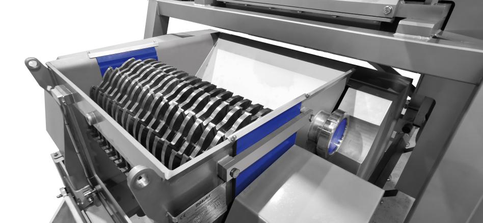 A unique feature of the GALAN 960 is that the machine offers the possibility of either separately collecting the abrasion generated during cutting in a collection box, or to discharge it with the cut product. Thus, depending on the product, the yield can be increased by up to 4%.