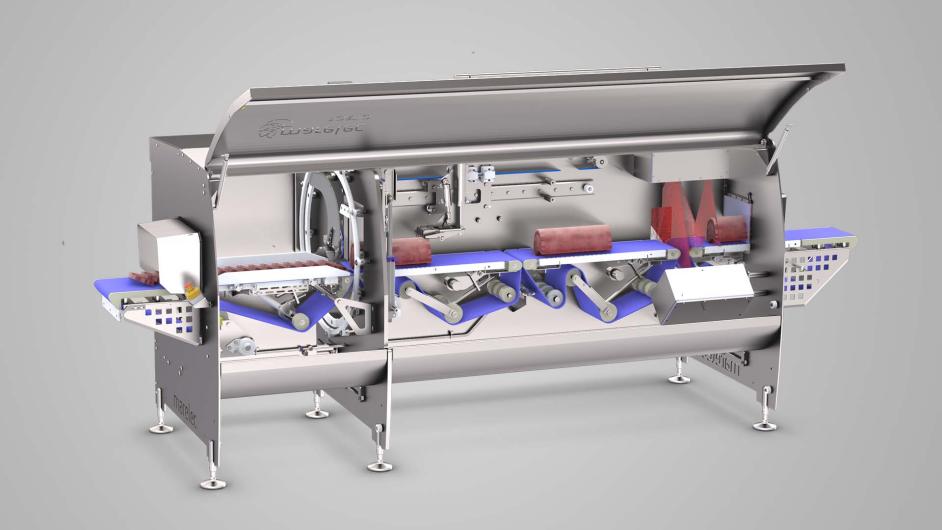 To prevent the product from moving during the cutting, several product holders act simultaneously, while the product is kept in place on a belt with specially designed spikes. A gripper with pneumatically controlled fingers holds the loins in place during cutting, in combination with a holder from the top and from the side. The specially designed knife has 2 sections: the sharp knife section to keep the quality of the meat and a serrated section to cut the bone easily.
