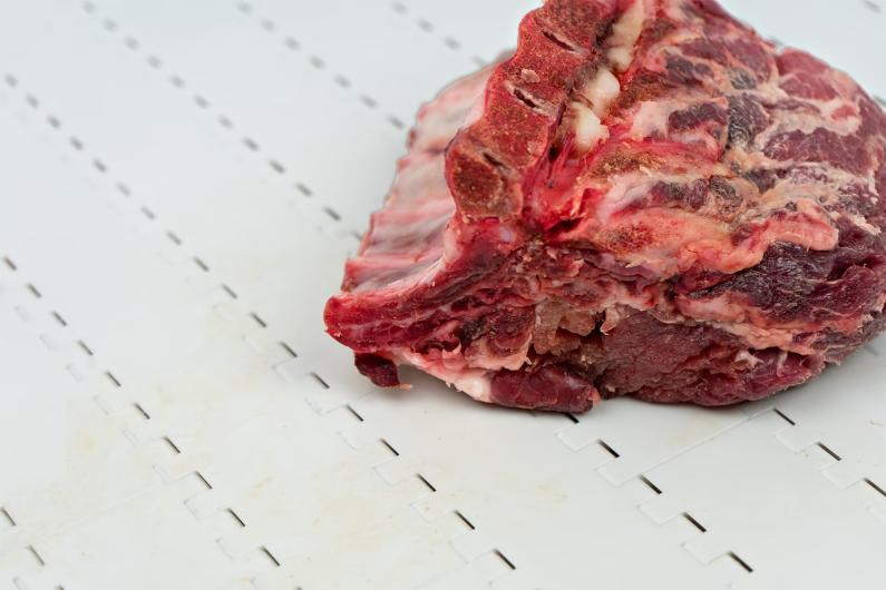 For primary red meat processing applications, durability and easy cleaning are key requirements for conveyor belts.