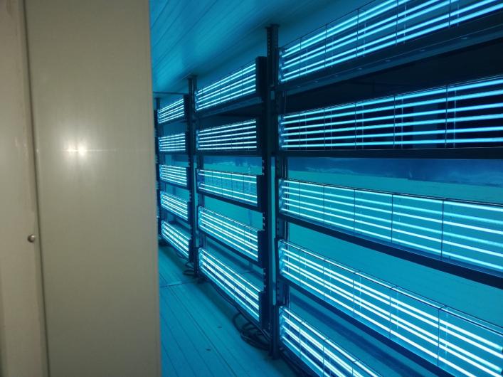In this case, the principle of UV-C disinfection for evaporators means that supply and room air is first sucked into the respective disinfection modules at the evaporator coolers. The on-site air performance of the modules ranges between 1620 and 4100 m³/h, depending on the requirements. Micro-organisms in the air - for example bacteria, mould, yeasts and viruses - are irradiated with UV-C light in a closed system chamber at a wavelength of exactly 253.7 nm and thus inactivated up to a proportion of 99%.