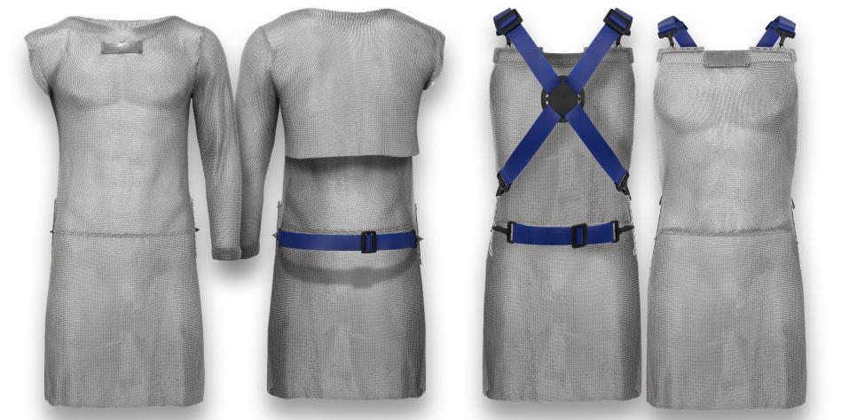 meshFlex® stab protection aprons and boloers are developed and produced from high-quality stainless steel and in accordance with the latest hygiene and safety requirements. The smaller metal ring mesh (ringØ: 3.8 mm) compared to conventional stab protection aprons and the high-quality wearing system guarantee extremely high wearing comfort. In addition, the Ergo-Fit system ensures a very good fit and a secure fit of the apron. The dense 3.8 mm ring mesh ensures maximum protection against life-threatening cuts and punctures. At the same time, the detectability of individual components increases food safety within the production processes.