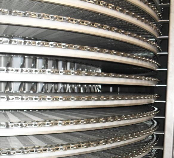 Your products decide the height of the side links and size of the spiral. The SingleStacker is available for product heights up to 110 mm, and belt width is available up to 1000 mm effective belt width. The low belt stack also reduces the air volume needed and minimises energy consumption. In- and out-feed in the same pressure zone, a unique air balance, together with wide evaporator fin spacing, enables long running time between defrosts — up to one week depending on product.