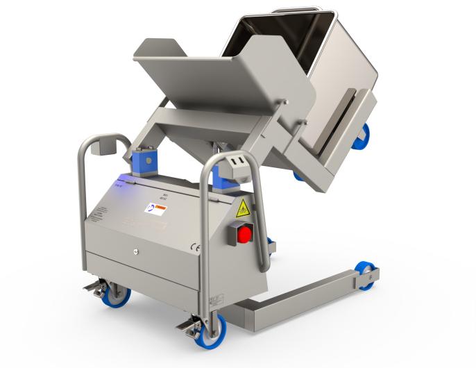 The Backsaver NT tipping machine is designed to empty standard DIN9797 200- or 300-liter meat carts, trolleys or buggies at a work table height.