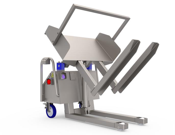 The SK 800 MK2 lifting and tipping device, commonly referred to as a twin column lift, is a versatile solution primarily used within the food industry. Its primary function is to elevate and tilt standard 600-liter EURO-containers, facilitating various processes such as forming, filling, grinding, mixing, and more. This adaptable twin column lift can also be tailored to accommodate barrels, different large containers, or other specific industrial applications, extending its utility to sectors like chemicals, pharmaceuticals, and engineering workshops.