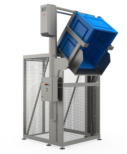 To ensure safety, the container to be tipped is positioned within the lifting frame, which features a retaining mechanism to secure the container in place. The twin column lift is driven by an electric gearbox motor with a brake. Operation is controlled via electrical push buttons, including an emergency stop button. The tipping process begins when the upper follower rollers of the lifting frame engage with the tipping curves, while simultaneously, the lower rollers continue to ascend within the columns.